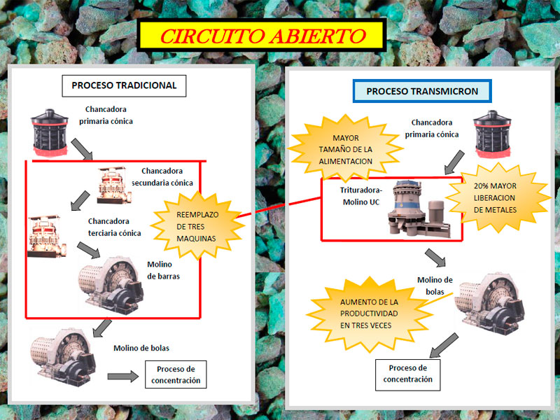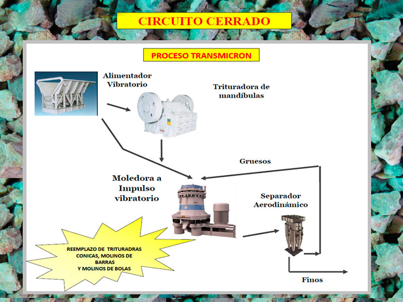 TRANSMICRON ha creado la avanzada tecnología de IMPULSO VIBRATORIO, logrando una molienda selectiva de materiales, con grado de reducción mayor de 30.